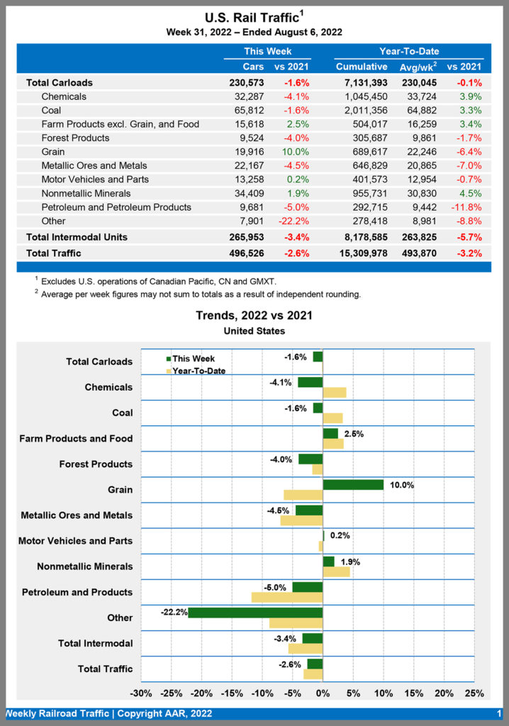 For the first 31 weeks of 2022, U.S. railroads reported cumulative volume of 7,131,393 carloads, down 0.1% from the same point last year; and 8,178,585 intermodal units, down 5.7% from last year. Total combined U.S. traffic for the first 31 weeks of 2022 was 15,309,978 carloads and intermodal units, a decrease of 3.2% compared to l2021.