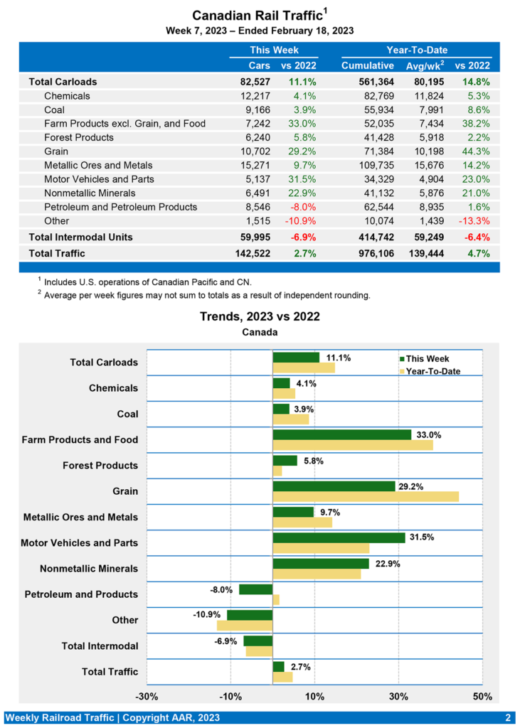 Canadian railroads reported 82,527 carloads for the week ending Feb. 18, 2023, rising 11.1%, and 59,995 intermodal units, decreasing 6.9% compared with the same week last year. For the first seven weeks of 2023, they reported cumulative rail traffic volume of 976,106 carloads, containers and trailers, a 4.7% gain.