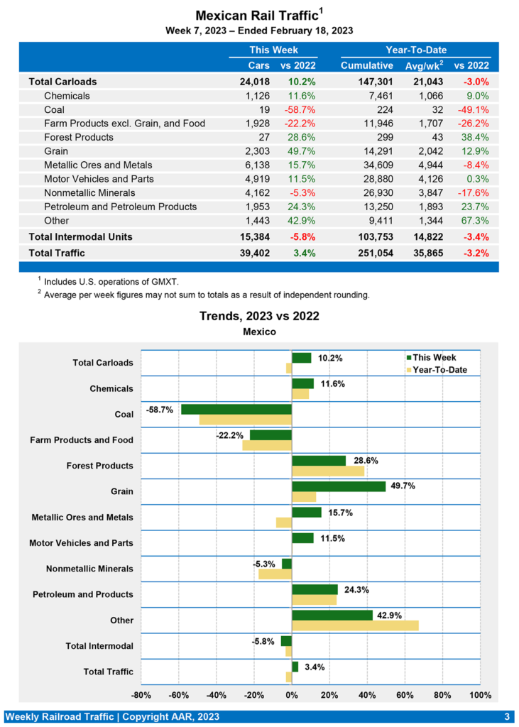 For the week ending Feb. 18, 2023, Mexican railroads reported 24,018 carloads, an increase of 10.2% from the same week last year, and 15,384 intermodal units, a decrease of 5.8%. Their cumulative volume for the first seven weeks of 2023 was 251,054 carloads and intermodal containers and trailers, dipping 3.2% from 2022.