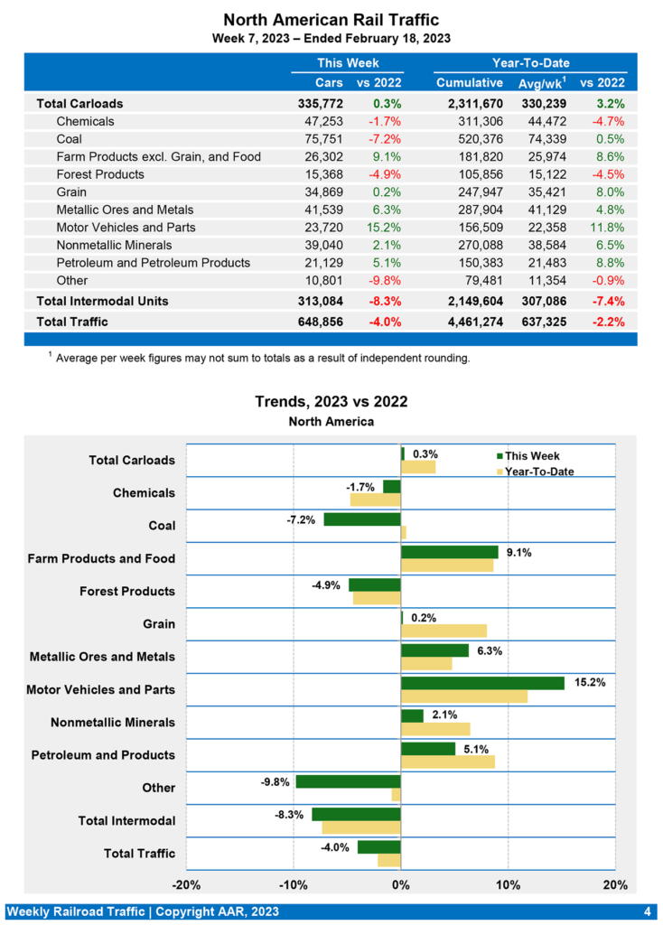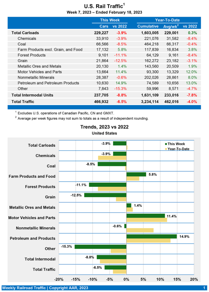 U.S. rail traffic for the week ending Feb. 18, 2023 (Week 7) dipped 6.5% from the same week last year, the Association of American Railroads (AAR) reported Feb. 22.