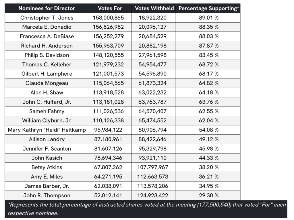 The certified results, NS says, confirm that shareholders have elected Richard H. Anderson, William Clyburn, Jr., Philip S. Davidson, Francesca A. DeBiase, Marcela E. Donadio, Sameh Fahmy, Mary Kathryn “Heidi” Heitkamp, John C. Huffard, Jr., Christopher T. Jones, Thomas C. Kelleher, Gilbert H. Lamphere, Claude Mongeau, and Alan H. Shaw to the company’s Board of Directors.