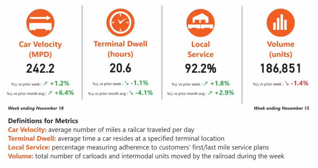“The BNSF network remains in solid condition as we head into the Thanksgiving holiday week and peak intermodal shipping season with positive momentum,” the Class I railroad told customers in a Nov. 21 online message. “Overall car velocity increased from the prior week and saw a 6% increase compared to October. Average terminal dwell was lower than the previous week, reaching the lowest level year-to-date and reflecting a 4% reduction from last month. Our local service compliance measure remains steady at 92%.”