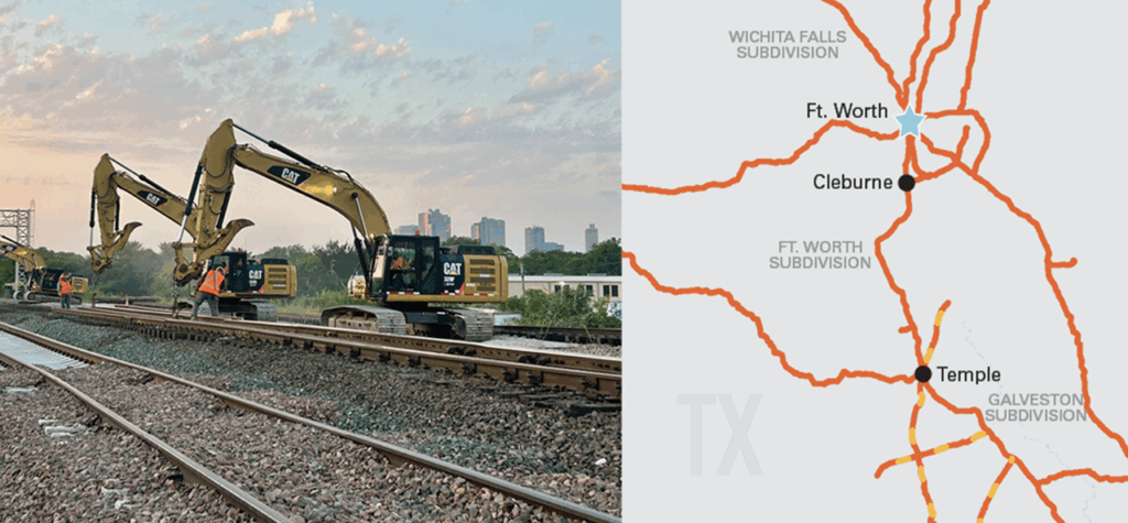 Fort Worth Subdivision: BNSF crews installing double track north of downtown Fort Worth (left) and project location map (right). (Courtesy of BNSF)