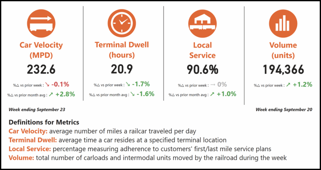 For the week ending Sept. 20, the railroad said that overall car velocity was “essentially unchanged” from the prior week and it is nearly 3% higher than the average level for August (see chart, top). Average terminal dwell improved compared with the previous week and month, according to BNSF, which added that the local service compliance metric “remains consistently above 90%.”