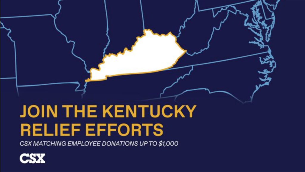 CSX is now is matching employee donations—up to $1,000, dollar-for-dollar—to the CSX Employees Disaster Relief Fund (EDRF) or the Red Cross through its Matching Gifts program. The CSX Employees Disaster Relief Fund provides financial assistance to employees who have suffered severe damage to their homes and property, according to the railroad. It said that donations to the Red Cross will support the wide range of assistance under way, including working with community and government agencies to assess damage and support emergency needs. The Red Cross is providing shelter, food and health services to families who lost their homes and belongings; Team Eastern Kentucky, formed by Kentucky Gov. Andy Beshear, is also assisting.