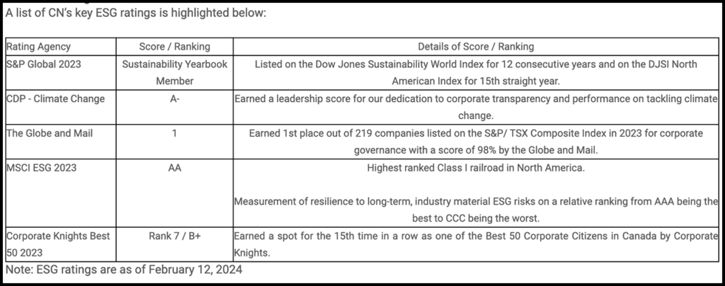 CN on Feb. 12 provided the following list of its ESG (Environmental, Social, and Corporate Governance) ratings: