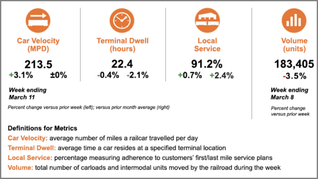 “The operation is maintaining relatively steady overall performance while improving fluidity across the network following the extreme winter weather in February,” BNSF reported in a March 14 customer notification. “Average car velocity has increased by over 3% compared to the previous week, with BNSF teams achieving higher daily levels this week. Terminal dwell time has improved slightly compared to last week and is down by over 2% from the previous month. Local service performance has also improved, now trending above 91%, reflecting a slight increase from the prior week and over a 2% improvement from the previous month.”