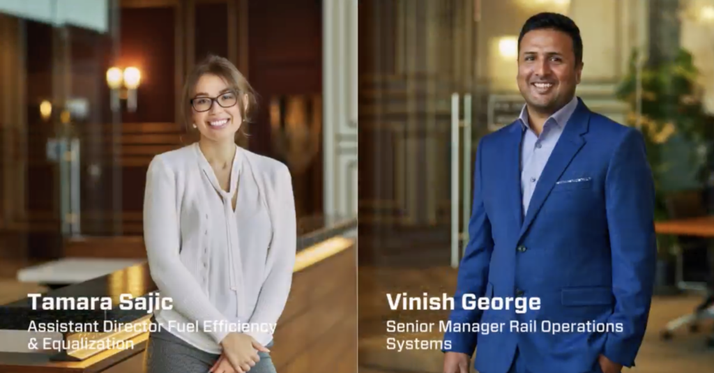CPKC congratulated the Fuel Center of Excellence team members: Tamara Sajic, Assistant Director Fuel Efficiency and Optimization and a 2023 Railway Age Women in Rail honoree; Vinish George, Senior Manager Rail Operations Systems; Cody Fischer, Manager Fuel Analytics; Darryl Perry, Locomotive Engineer; John Brackenbury, Rail Traffic Controller; and Dugan Shry, Quality Assurance Operating Practice Manager.