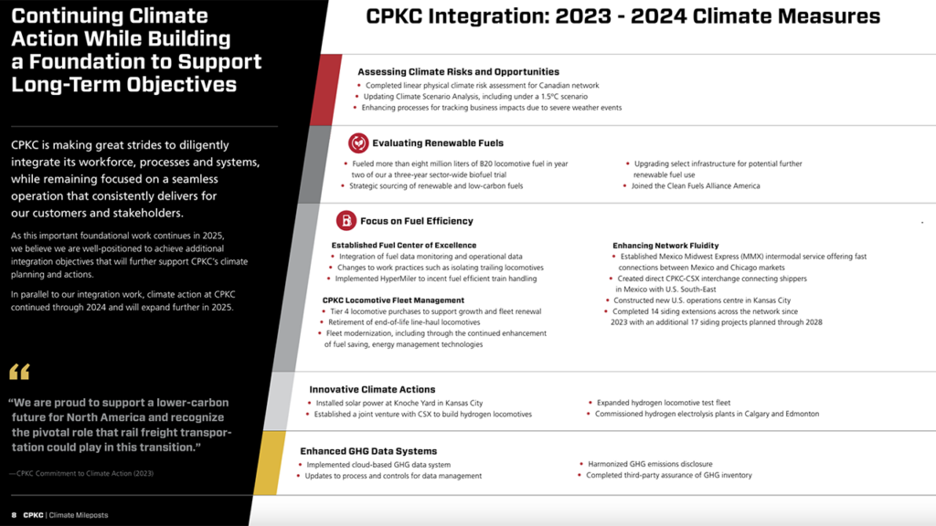 In its 2025 Climate Mileposts report issued last month, CPKC highlighted the Fuel Center of Excellence as one of the actions its taking to improve sustainability (see below).