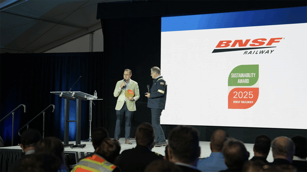 During the grand opening ceremony, BNSF Executive Vice President and Chief Marketing Officer Tom Williams presented Hybar with a 2025 Sustainability Award (pictured above); the company was one of 32 recipients.