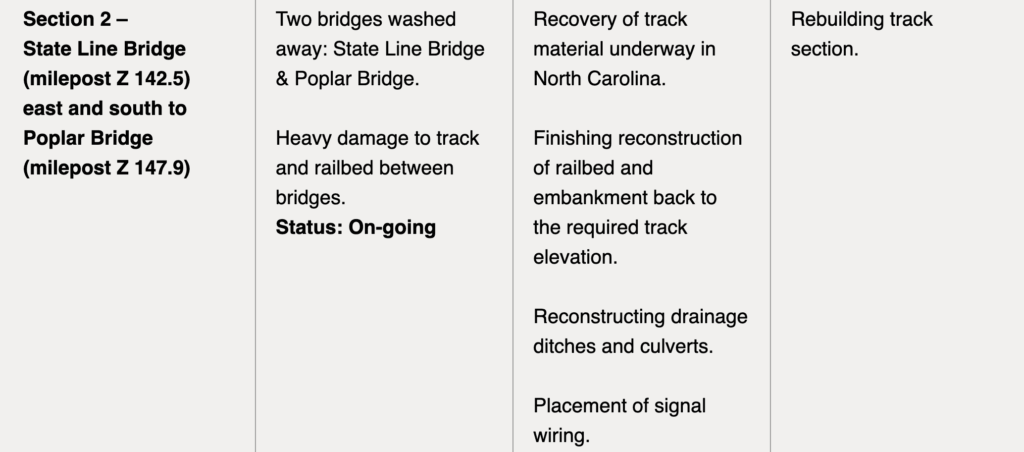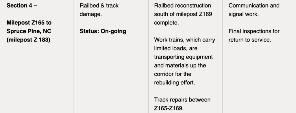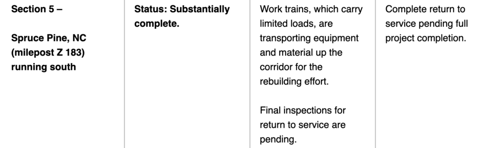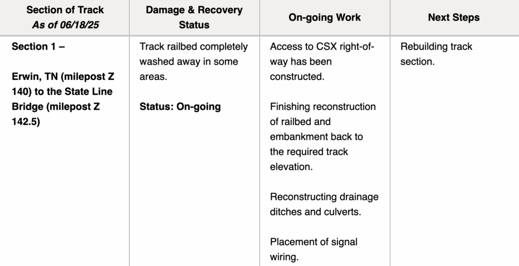 “CSX is making significant strides in rebuilding its Blue Ridge Subdivision, a critical 60-mile stretch of railroad in North Carolina and Tennessee that was devastated by Hurricane Helene” last fall, the Class I reported Aug. 15.