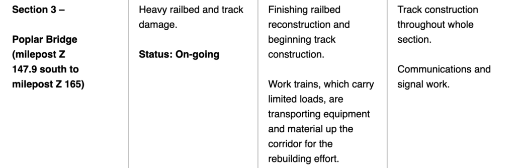 The project is divided into sections based on the type of work. Details about the section of track under reconstruction, the damage and recovery status, a description of the work in progress, and the next steps are provided in the table below: