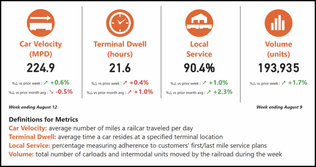 Despite the challenges, BNSF reported, average car velocity and terminal dwell “remain steady” compared with the previous week and the average levels reported for July. The railroad’s local service compliance averaged 90% for the week, which BNSF said was higher than the prior week and more than 2% higher than the previous month.