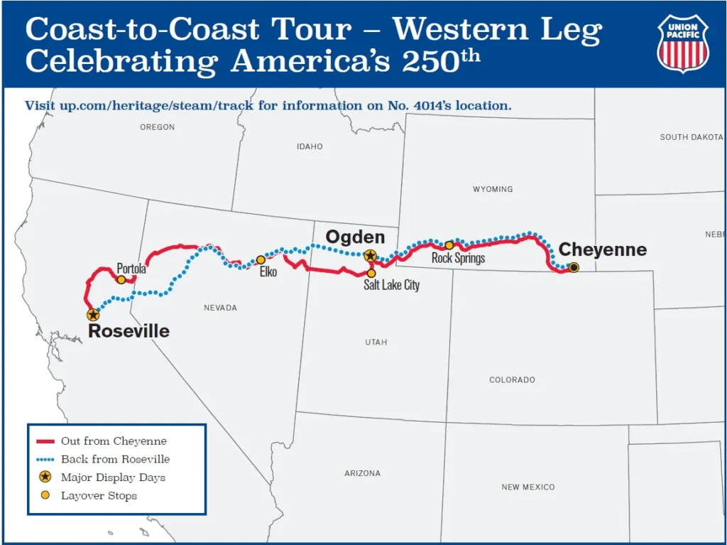 The Big Boy on March 29 left Cheyenne, Wyo., to embark on the first leg of its coast-to-coast tour, making stops in California, Nevada, Utah, and Wyoming, with public display days planned in Roseville, Calif., and Ogden, Utah. It will return to Wyoming on April 24. (See map below.)