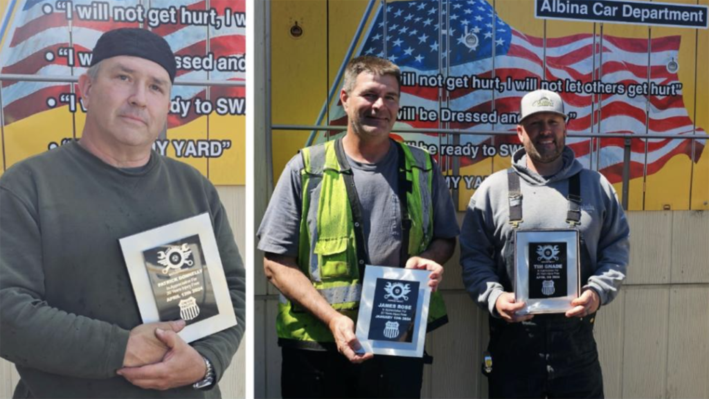 UP on May 29 reported that Railcar Technicians Patrick Donnelly, Steve Dorio, Tim Gnade, James Rose and Steven Ruggles at Albina Yard in Portland, Ore., marked a safety milestone: working 20 years injury-free.