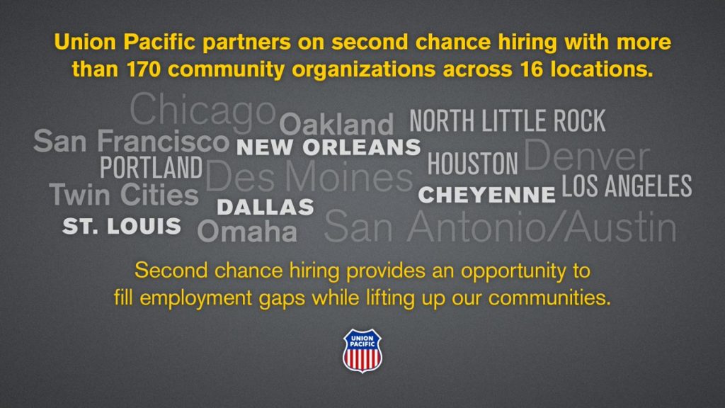 According to UP, Second Chance Hiring, which “provides an opportunity to fill employment gaps while lifting up communities,” will be available in Chicago, Ill.; Oakland, Calif.; North Little Rock, Ark.; San Francisco, Calif.; New Orleans, La.; Portland, Ore.; Des Moines, Iowa; Houston, Tex.; Denver, Colo.; Twin Cities, Minn.; Dallas, Tex.; St. Louis, Mo.; Omaha, Nebr.; San Antonio, Tex.; Austin, Tex.; Cheyenne, Wyo.; and Los Angeles, Calif.