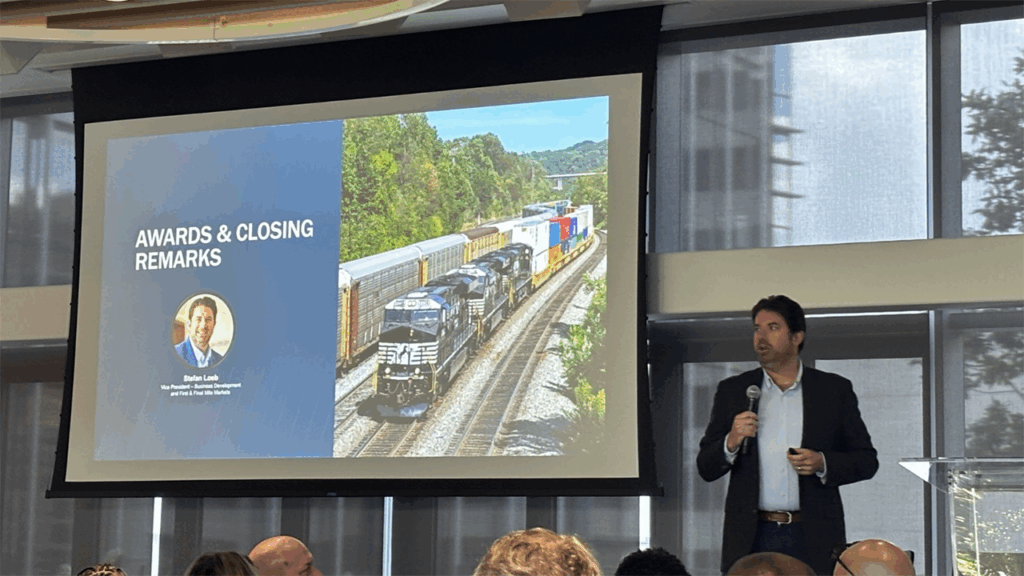 The meeting included the presentation of the first Alan Lambert Short Line of the Year Award. Alan Lambert, Loeb said, was “a fallen NS colleague and friend to so many at NS, short lines, and customers over the years.” Stephanie Roop and Jodi Heath, two of Lambert’s close friends, presented the award to OmniTRAX, Inc.’s Alabama & Tennessee River Railway, an NS partner that Loeb said “doubled its traffic year-over-year in 2024 through true collaboration and teamwork.”
