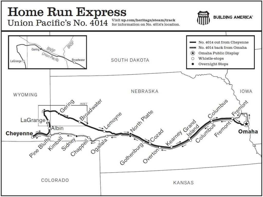 Big Boy, which will leave Cheyenne, Wyo., on June 7, will make numerous whistle-stops in Wyoming and Nebraska before returning to its home base on July 3. During its Omaha display, the public will be allowed to see the locomotive up close between June 15-21 and June 24-25 from 12 p.m. to 6 p.m.
