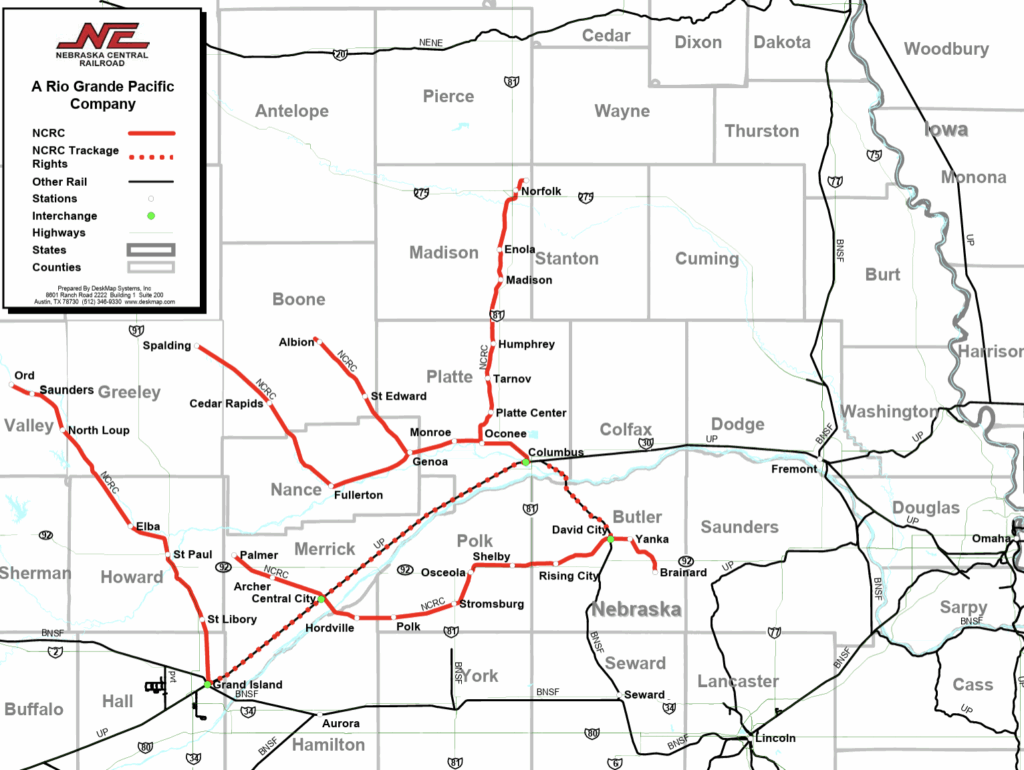 Nebraska Central Railroad Company is a 340-mile network comprising five former UP branch lines and one former BNSF branch line (see map above). Trackage includes rights to approximately 60 miles of UP main line between Grand Island, Neb., and Columbus, Neb. The railroad, through its interchanges with UP (Columbus, Central City, and Grand Island) and BNSF (David City), is an integral part of grain shipments in the region. It serves nearly a dozen unit loading facilities and can handle more than 250 unit trains annually in conjunction with its Class I partners.