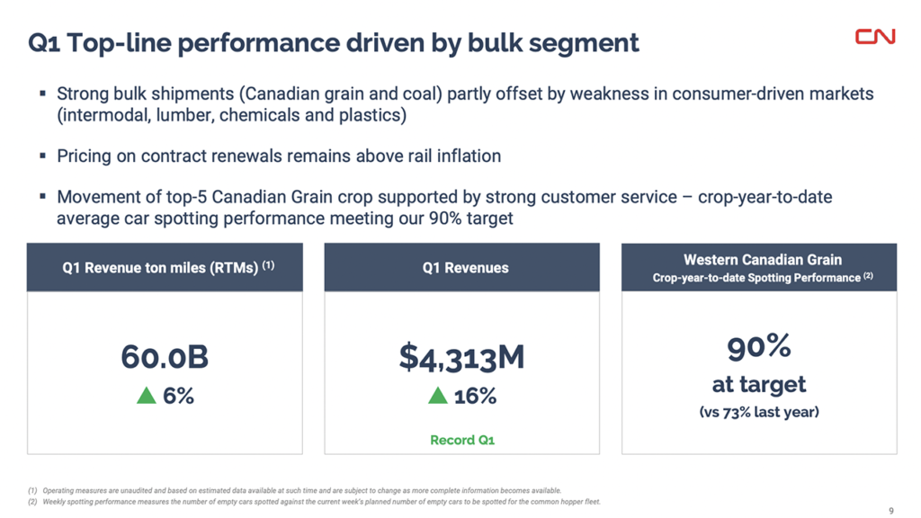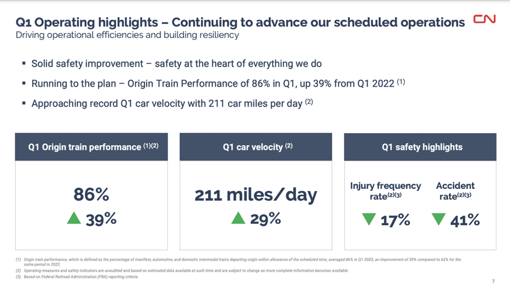 - Operating income reached C$1.662 billion, a first-quarter record, according to CN. It was up C$435 million or 35% over first-quarter 2022 (or up 34% on an adjusted basis). This demonstrates the “strength and resiliency of the network,” CN said.