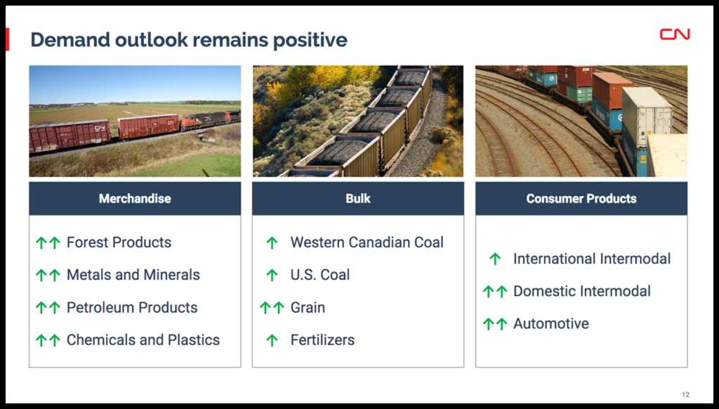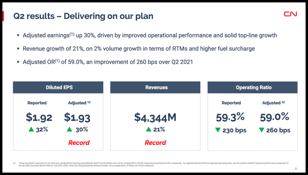 Looking ahead, CN confirmed that it still expected to deliver approximately 15%-20% adjusted diluted EPS growth in 2022; a full-year operating ratio below 60%; and a ROIC (return on invested capital) of approximately 15%. Additionally, it said it was “planning for full-year low single-digit volume growth (RTMs) with a normalized Canadian grain crop this fall.” Capex is slated to remain at 17% of revenues.