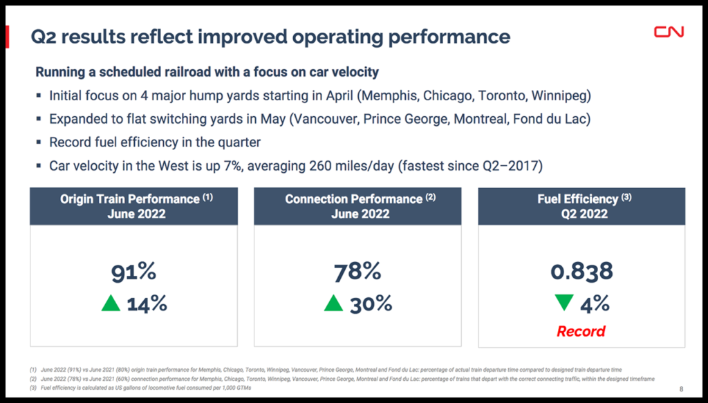 CN said that for the month of June, “origin train performance, defined as the percentage of actual train departure time compared to designed train departure time at selected yards, reached 91%, an improvement of 14% compared to 80% for the same period in 2021.”