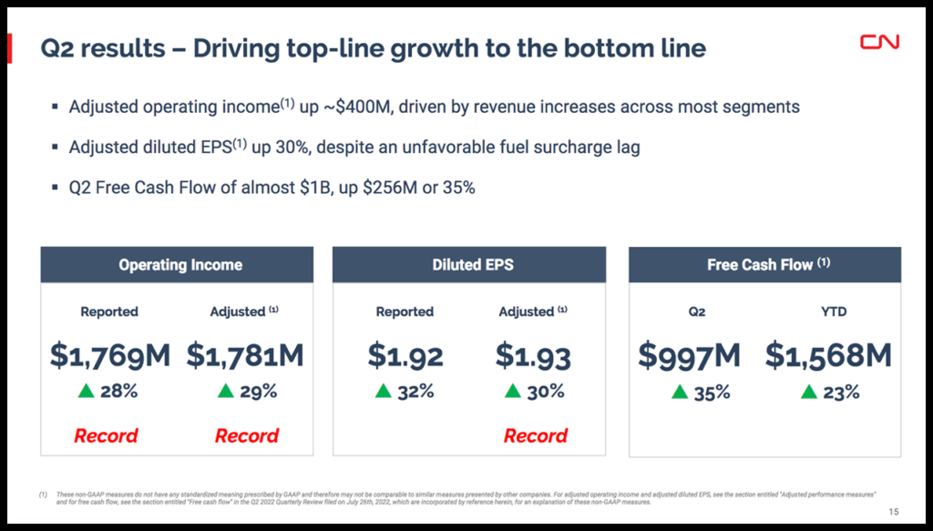 • Operating expenses of C$2.575 billion increased by 16% from second-quarter 2021. This was “mainly driven by higher fuel prices and the negative translation impact of a weaker Canadian dollar; partly offset by lower average headcount,” CN reported.