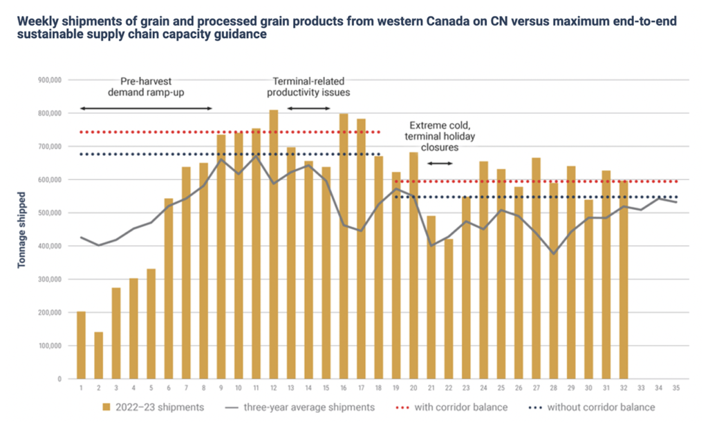 In its 2022-23 Grain Plan, released last summer, CN’s guidance to customers and grain supply chain stakeholders was that on a sustainable basis, CN could deliver up to 744,000 metric tons per week of shipments of grain and processed grain products outside of winter, and up to 595,000 metric tons per week during winter. “Being able to achieve those levels requires having all the conditions in place, including no mainline disruptions, fluidity across grain shipment corridors, normal winter operating conditions, and other considerations,” according to the Class I railroad. “For the most part, those conditions have been present.”