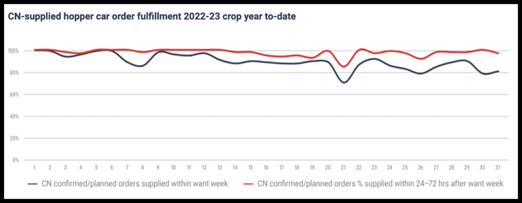 According to CN, it is not just about how much grain is moving every week. Consistency is key to customers and grain supply chain stakeholders. The railroad said it has been consistently supplying 90%-100% of planned and confirmed CN-supplied car orders within the week they were requested or within one to three days after the end of the want week, which translated into “strong and steady grain movement.”