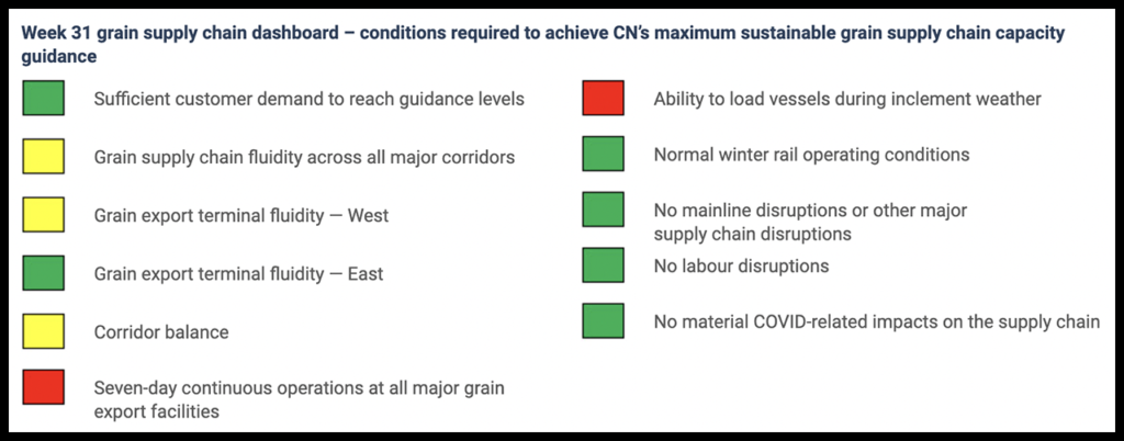 CN said it has provided a Weekly Western Canadian Grain Report since the 2016-17 crop year to get “into the ‘why’ of what’s going on in the supply chain.” Up front there is a supply chain dashboard, illustrating “how the supply chain is doing, and it ties back to all the conditions required to achieve maximum supply chain capacity,” according to the railroad.