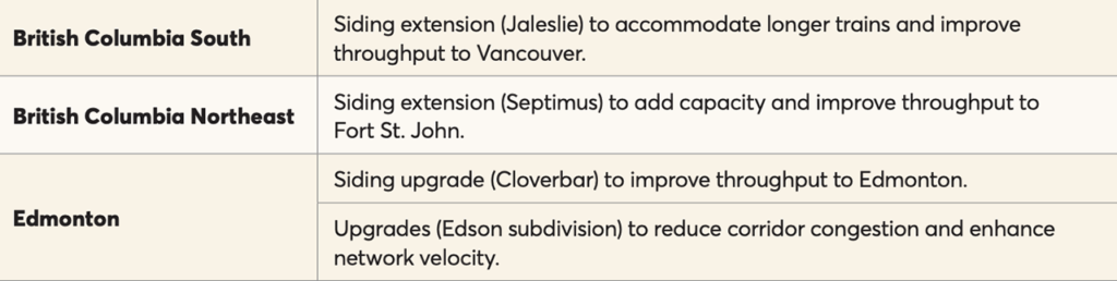 CN reported that among the factors affecting its overall rail capacity for the crop year are demand forecast accuracy, which helps determine short‑ and long‑term resource planning; resource planning, including infrastructure, crews, locomotives and rolling stock; weather; and “corridor balance.” According to the railroad, “the quality and timeliness” of hopper car demand forecasts vary significantly among its grain customers. Typically, it said, “demand planning less than 12 months out is focused heavily on operating crew base and locomotive fleet size.” Demand, it said, “is converted into train counts, which in turn is converted into crew and locomotive demand.” Longer‑term forecasts focus on rail infrastructure and network capacity, according to CN, which said it ”monitors traffic levels on individual sections of track and individual traffic corridors to help assess what additional track infrastructure is required.” From initial planning to completion, infrastructure investments “can take months or years, depending on the scale.” CN said it has invested into the network more than $15 billion between 2019 and 2023, with nearly two‑thirds of that investment going into track infrastructure and railway assets; for 2024, its capital expenditures are expected to increase slightly over previous years, to approximately $3.5 billion. New major rail infrastructure capacity enhancement projects in Western Canada expected to be in service in 2024–25 include: