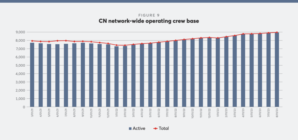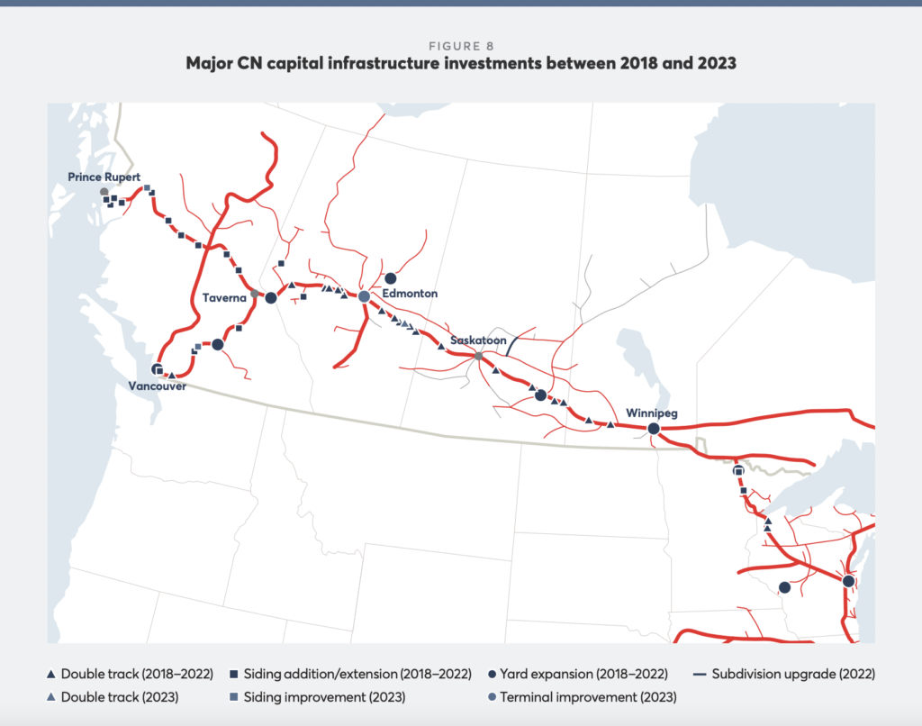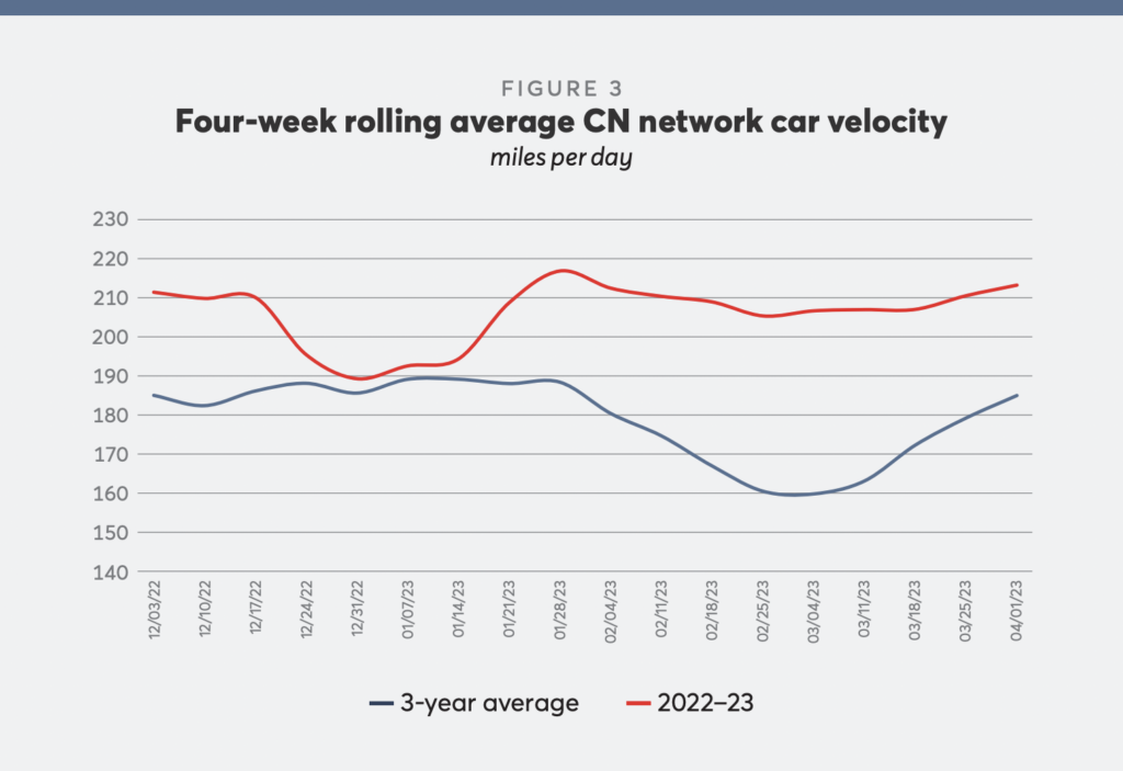 3. Improving network performance. CN said it has made fundamental changes to its operating plan to increase car velocity and reduce terminal and yard dwell. As a result, it can handle more volume with the same number of assets and crews. Launched in 2022, the operating plan “delivered the best railcar velocity since 2016 and strong, consistent traffic movement,” reported the railroad, which added that further plan enhancements are expected to deliver incremental improvements.