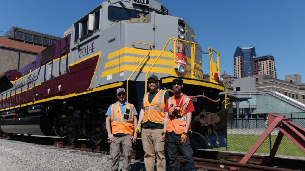 CP Heritage SD70ACu locomotive No. 7014 pictured with CP Road Foreman of Engines Chris Lestina (left), Engineer Tyler Rosenlund (center) and Conductor Andrew Smeltzer, who assisted in its delivery to Union Depot in St. Paul, Minn., for Train Days 2022. (Photograph Courtesy of CP via Twitter)