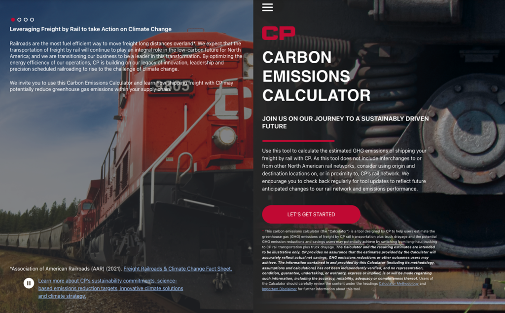 The carbon emissions calculator “gives customers greater insight into the carbon footprint of its freight rail transportation services,” CP said. “The tool enables complex, tailored emissions calculations and incorporates customer-specific shipping details to calculate route and commodity-specific greenhouse gas (GHG) emissions.. It allows CP’s customers to explore the impacts of their own emissions footprint and make decisions to reduce freight transportation emissions by choosing the lowest carbon-emitting mode of transportation. The tool provides additional insights into the climate-related benefits of shipping freight with CP’s rail services, an overview of lifecycle emissions from logistics services and a comparison of CP’s rail services to long-haul trucking alternatives.”