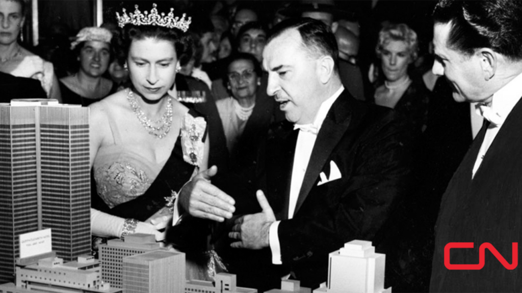 CN provided the photo below on Twitter, explaining that in 1959, the railroad “welcomed Her Majesty to unveil the model of the new hotel that bears her name and CN’s building in Montreal.”