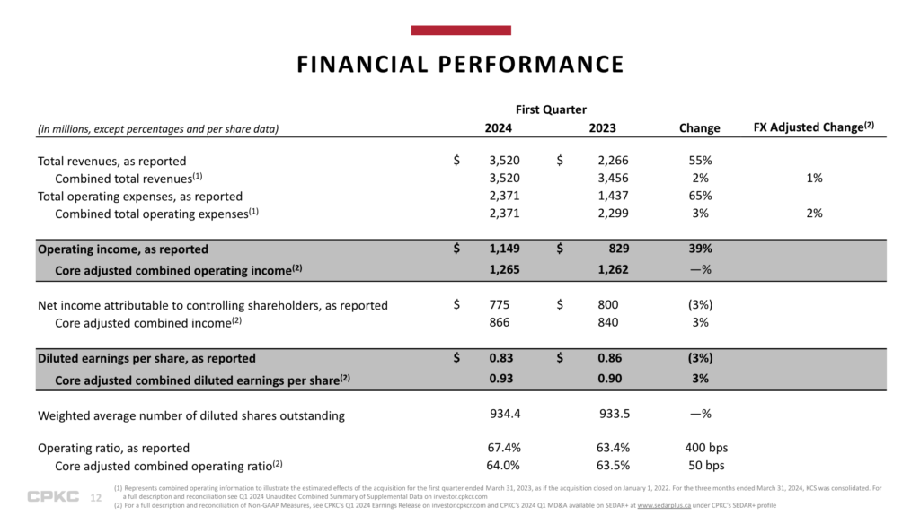 For first-quarter 2024, CPKC reported revenues of $3.5 billion, up 55% from first-quarter 2023; diluted earnings per share (EPS) of $0.83, down 3% from the prior year period; and core adjusted combined diluted EPS of $0.93, up 3% from first-quarter 2023.