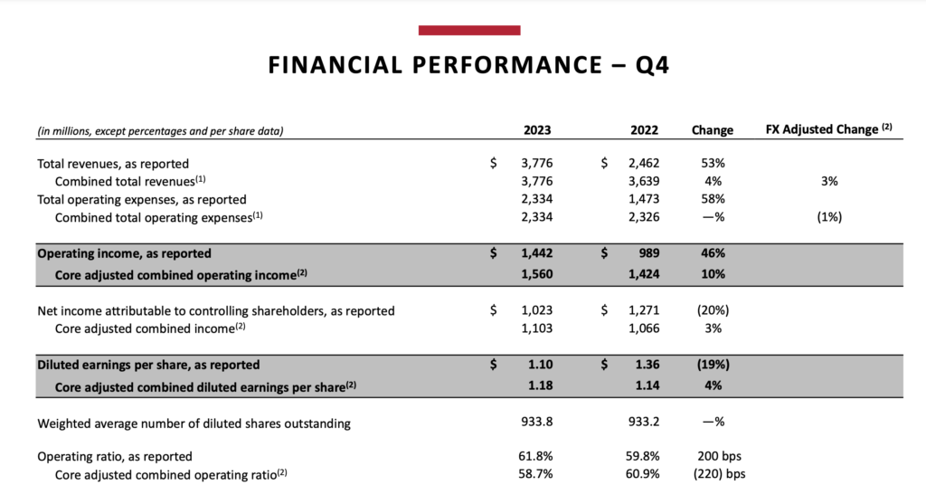- Core adjusted combined OR2 decreased 220 basis points to 58.7% from 60.9% in 4Q22.