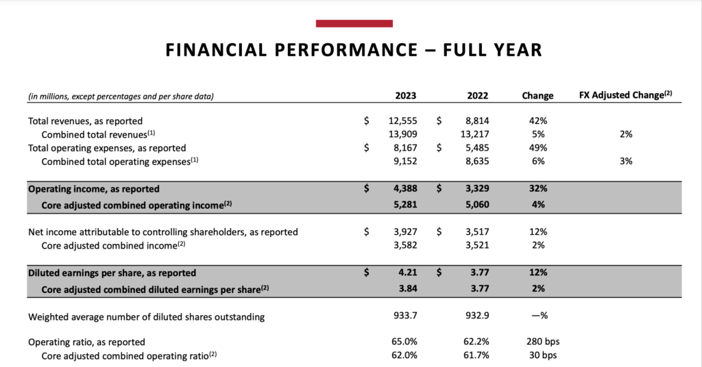 - Core adjusted combined OR2 increased 30 basis points to 62.0% from 61.7% in 2022.