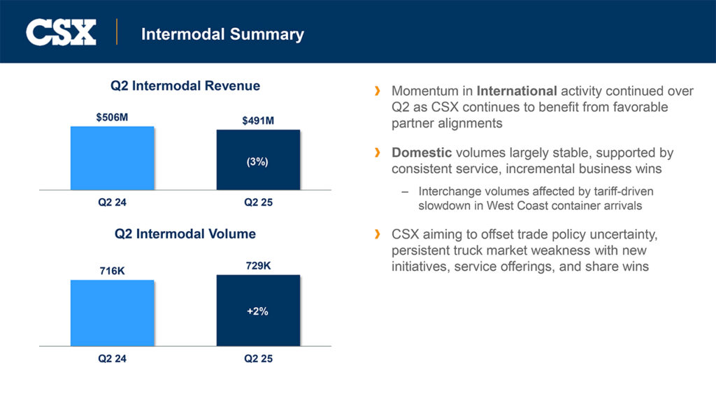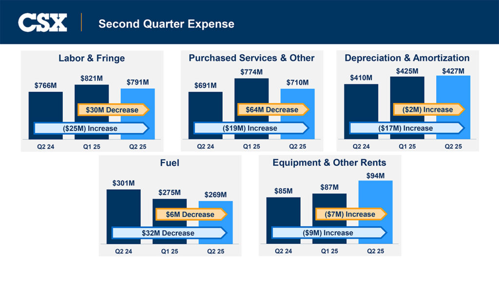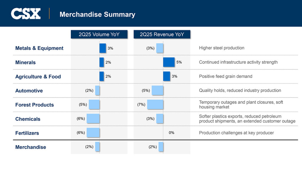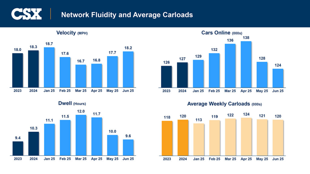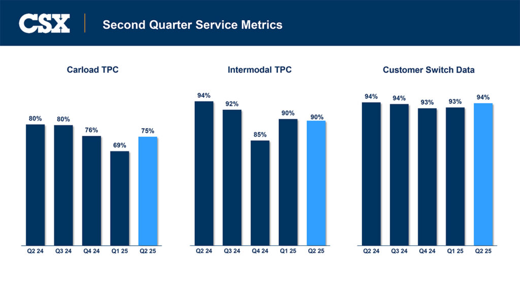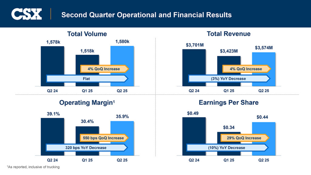 CSX experienced a tough second quarter and first half of 2025, compared to the prior-year’s periods, but saw some sequential improvements over this year’s first quarter while “managing through mixed market conditions, supported by operational momentum and new business wins.” TD Cowen says that CSX is “sticking to operations, with service trending in the right direction” (below).