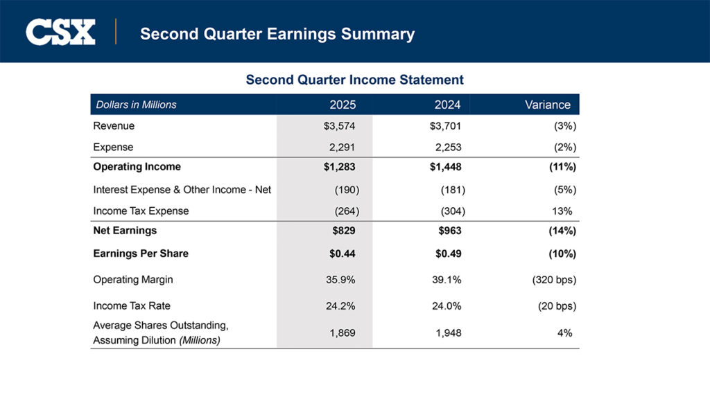 CSX posted 2Q25 operating income of $1.28 billion compared to $1.45 billion in the prior year period. Net income was $829 million, or $0.44 per diluted share, compared to $963 million, or $0.49 per diluted share. Total volume of 1.58 million units for the quarter was flat compared to second quarter 2024, but up 4% sequentially from 1Q25’s 1.52 million units.