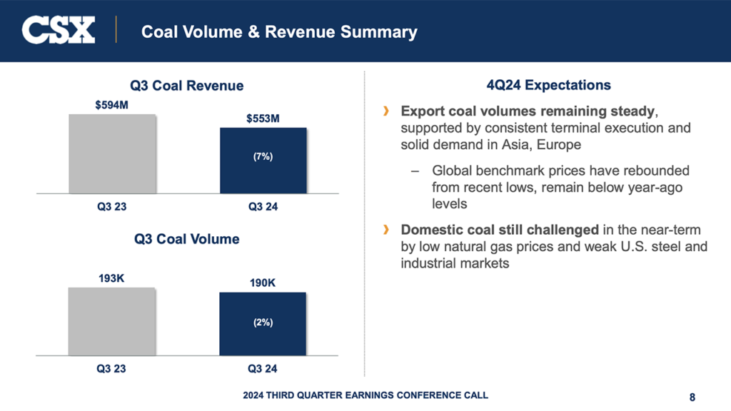 “Coal RPU -5.4% y/y came in modestly softer than our cautious estimates and management guided to further weakness in 4Q with another LSD sequential decline. Soft industrial activity combined with low natural gas prices continues to pressure domestic volumes (tonnage -12% y/y) and yields. With the industrial economy outlook generally soft, we expect these headwinds to persist. While export coal tonnage +10% remains healthy, CSX pointed to cracks in met coal pricing.