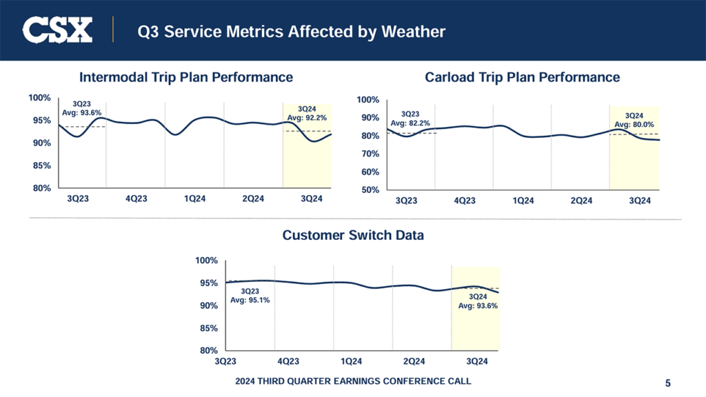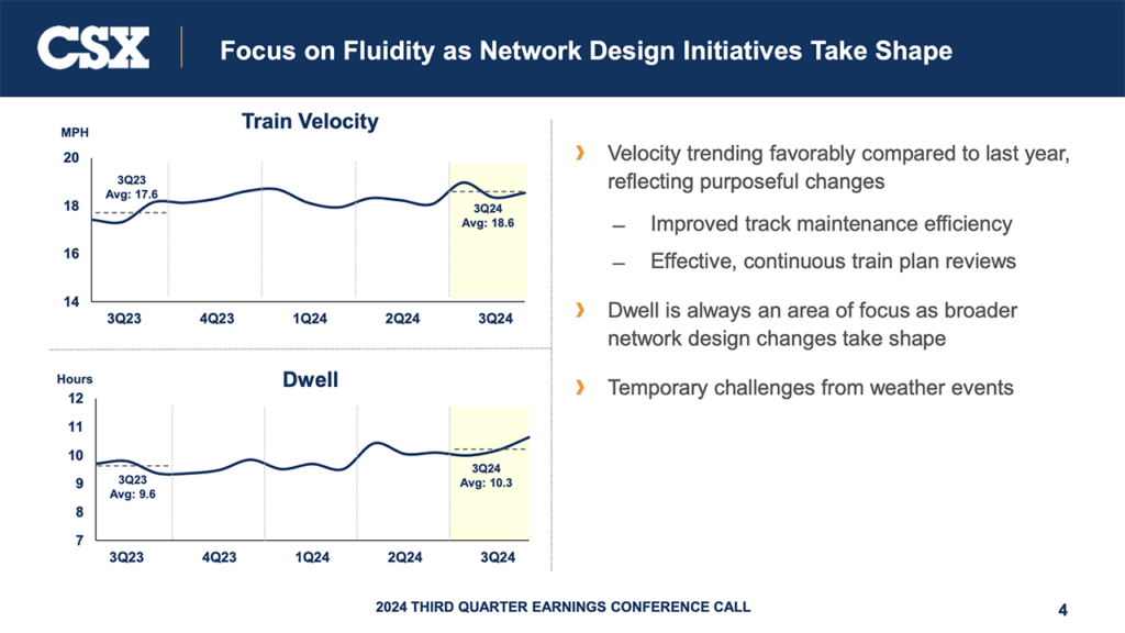 On the operations side for third-quarter 2024, CSX said velocity trended “favorably” compared with last year, “reflecting purposeful changes” including improved track maintenance efficiency and “effective, continuous train plan reviews.” CSX noted the “temporary challenges” it experienced from weather events (see below for service metrics affected by weather).