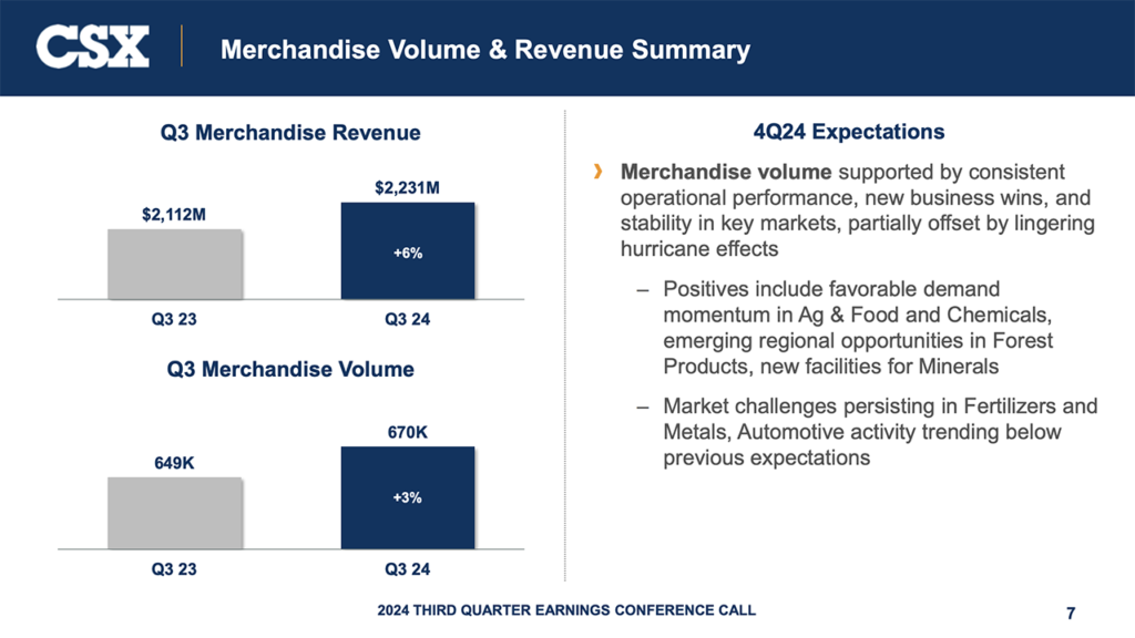 CSX provided a 2024 guidance update. While the railroad said it delivered “meaningful” growth and margin expansion in the third quarter, “external factors” will make the fourth quarter “more challenging.” Fourth-quarter volume is expected to grow “modestly,” according to the railroad, “with continued strength in Chemicals, Ag & Food, and other Merchandise markets offset by softer-than-expected Metals and Automotive conditions, along with continuing effects from the recent hurricanes.”