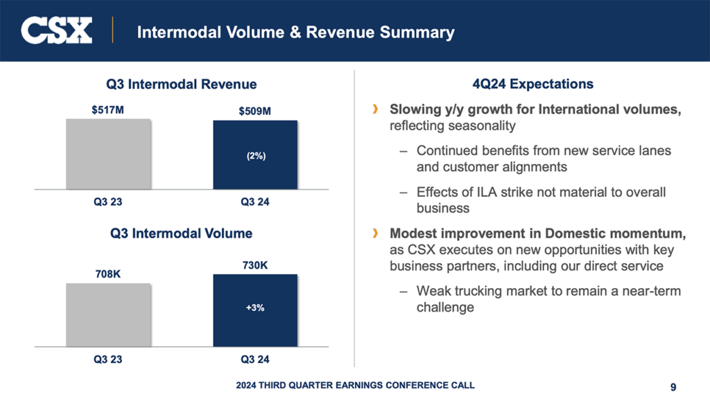 “Intermodal volumes grew by 3% in 3Q though was partially offset by rev/car declining 4.5% y/y, and stepping down sequentially for the third quarter in a row. International shipments grew mid-single digits while domestic shipments were flat; management did call out a shift towards the West Coast in the quarter which lifted the transcon interchange though not material to the overall business. We model ~flat IM RPU sequentially as CSX pointed to J.B. Hunt’s commentary that pricing has likely bottomed out (though will limit pricing upside until 2H25 at the earliest). IM volumes are down 11% through the first two weeks of the quarter due to weather impacts, and we will continue to monitor weekly carloadings to see the pace of recovery in the network.
