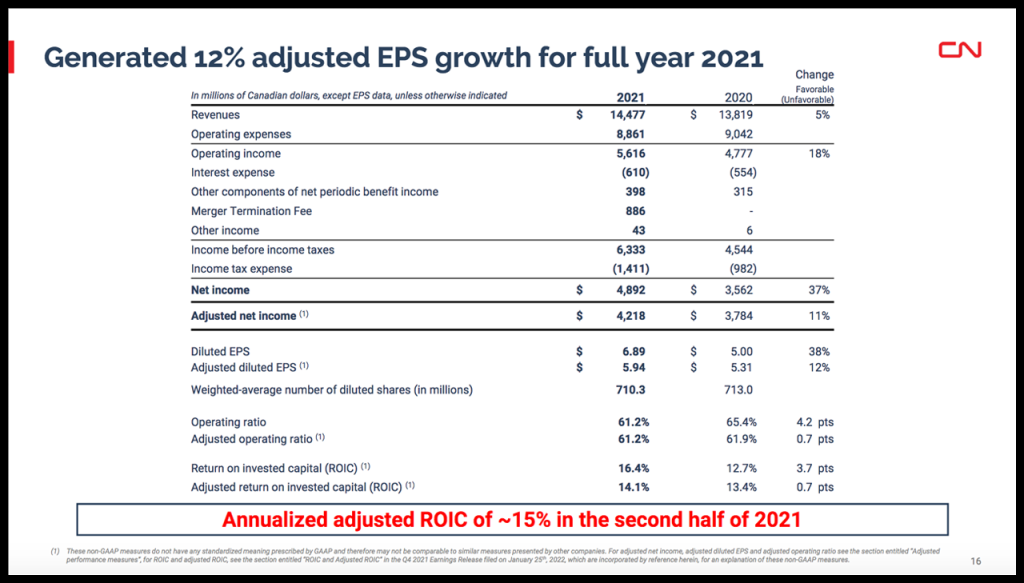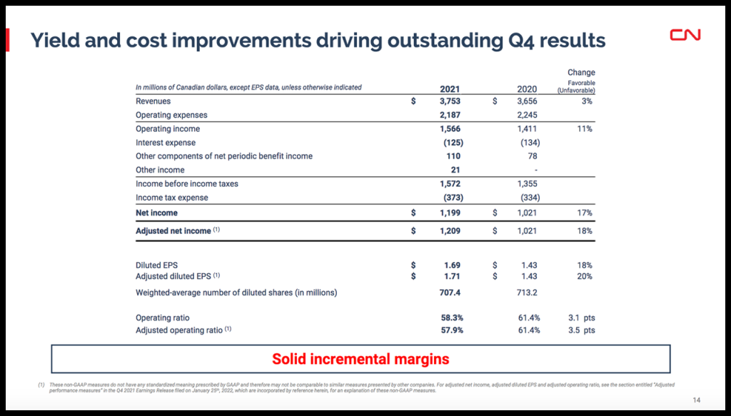 - Revenues of C$14.48 billion, an increase of C$658 million or 5%, “mainly attributable to freight rate increases, higher applicable fuel surcharge rates and an increase in intermodal ancillary services; partly offset by the negative translation impact of a stronger Canadian dollar and lower volumes of Canadian grain in terms of RTMs. RTMs increased by 1% despite the unfavorable impact of the ongoing supply chain challenges, the polar vortex in February, the forest fires and drought in Western Canada over the summer, and the B.C. washouts in 4Q21. Freight revenue per RTM increased by 4%, mainly driven by a decrease in the average length of haul, freight rate increases and higher applicable fuel surcharge rates; partly offset by the negative translation impact of a stronger Canadian dollar.”