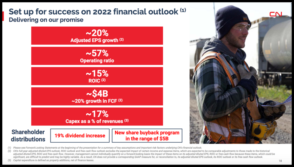 CN said it expects to deliver approximately 20% adjusted diluted EPS growth, vs. 2021 adjusted diluted EPS of C$5.94. This assumes total RTMs in 2022 will increase in the low single-digit range vs. 2021. In 2022, CN plans to invest approximately 17% of revenues in its capital program. It continues to target an OR of approximately 57% for 2022 as well as approximately 15% of ROIC, and is also targeting free cash flow of approximately C$4.0 billion, compared to C$3.3 billion in 2021.