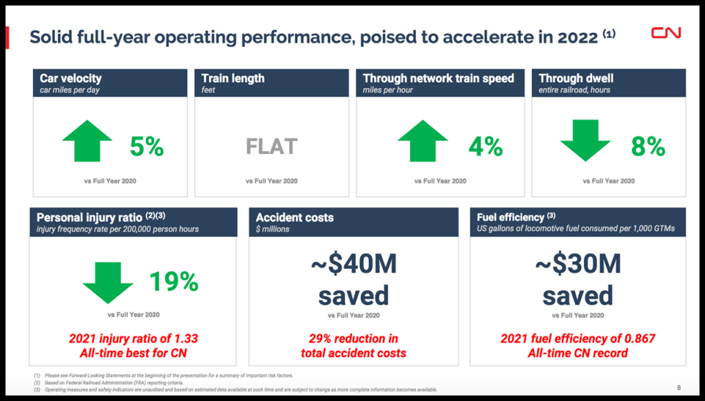CN’s operating performance “improved across most measures when compared to 2020, specifically through network train speed, dwell and car velocity, despite negative impacts from the polar vortex in February, the forest fires in Western Canada over the summer and the washouts in British Columbia caused by severe rain and flooding, resulting in a network shutdown in the region for three weeks in the fourth quarter,” CN noted. “The company capitalized on its prior year’s strategic investments in its infrastructure and its continued focus on efficiency and network fluidity. In addition, our fuel initiatives allowed us to achieve an all-time record fuel efficiency, which improved by 3% to a record 0.867 U.S. gallons of locomotive fuel consumed per 1,000 GTMs.