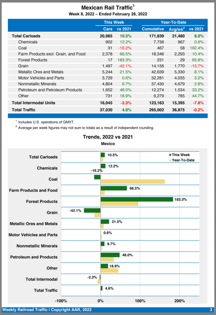 Mexican railroads reported 20,985 carloads for the week, a 10.5% boost from the same week last year, and 16,045 intermodal units, a 2.3% decline. Their cumulative volume for the first eight weeks of 2022 was 295,002 carloads and intermodal containers and trailers, decreasing 0.2% from the 2021 period.