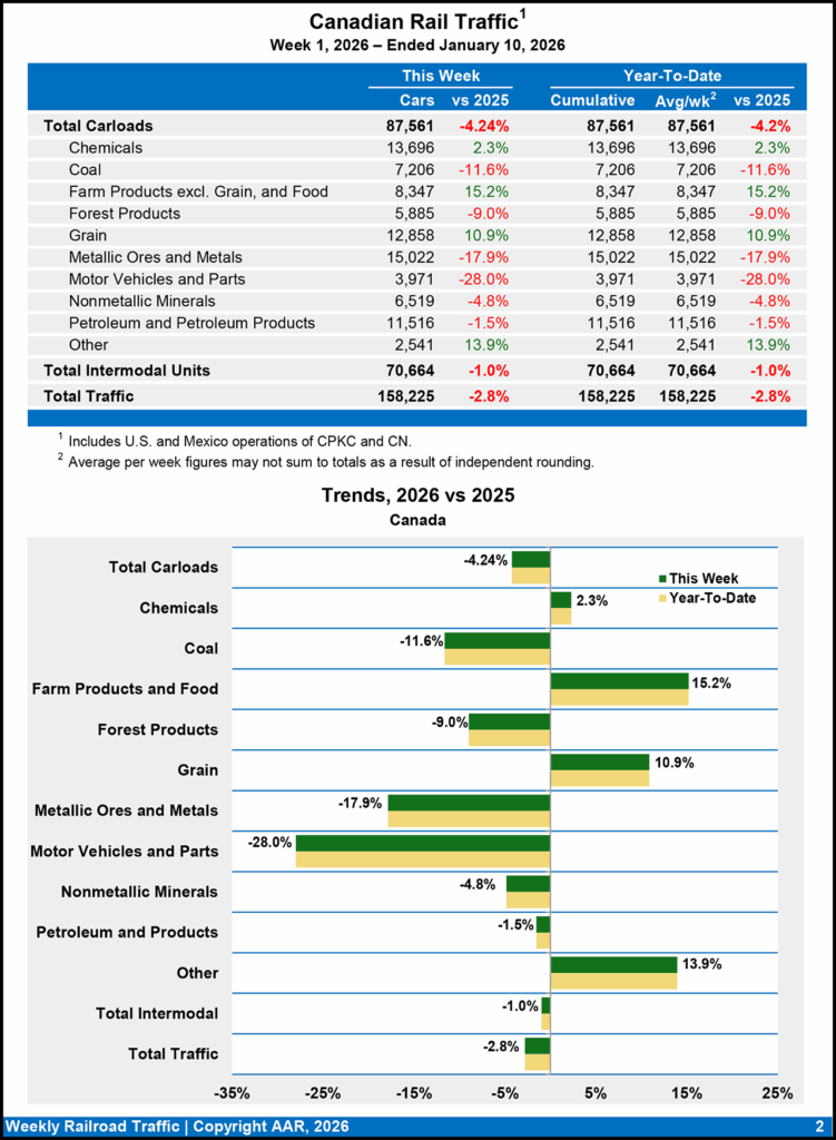 Canadian railroads reported 87,561 carloads for the week ending Jan. 10, 2026, down 4.2%, and 70,664 intermodal units, down 1.0% compared with the same week in 2025.