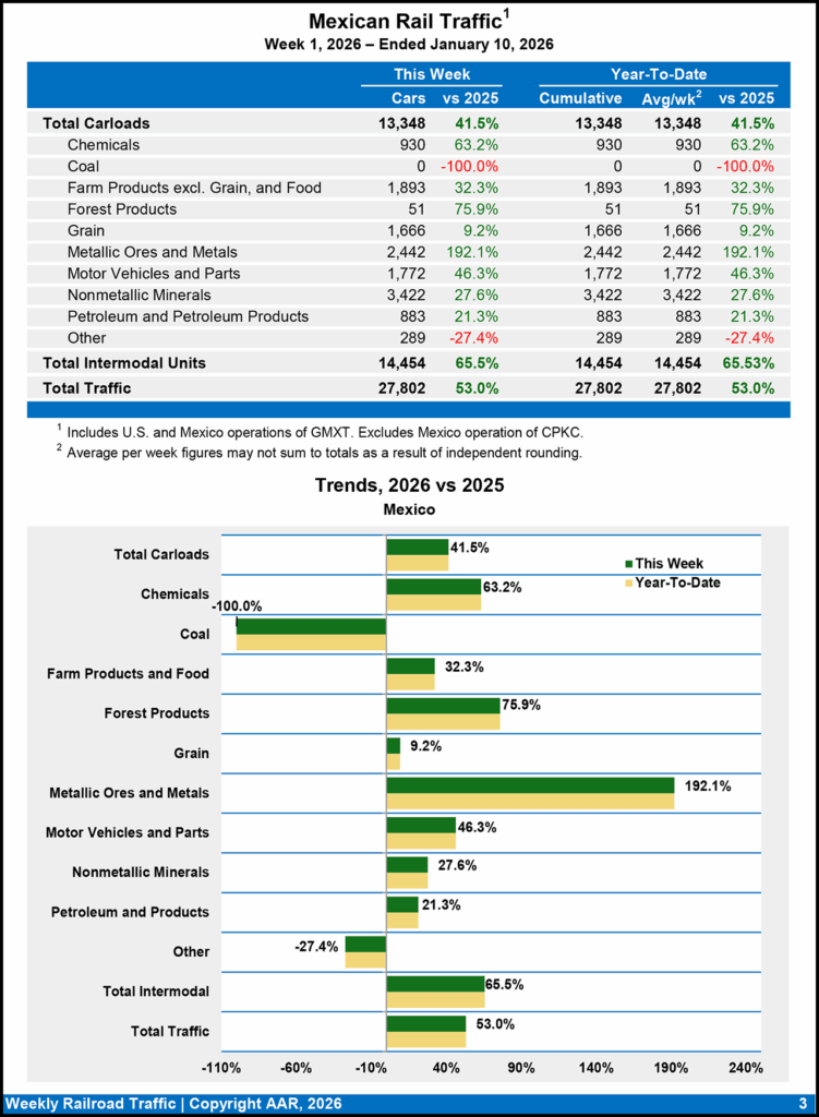 Mexican railroads reported 13,348 carloads for the week ending Jan. 10, 2026, up 41.5% from the same week last year, and 14,454 intermodal units, up 65.5%.